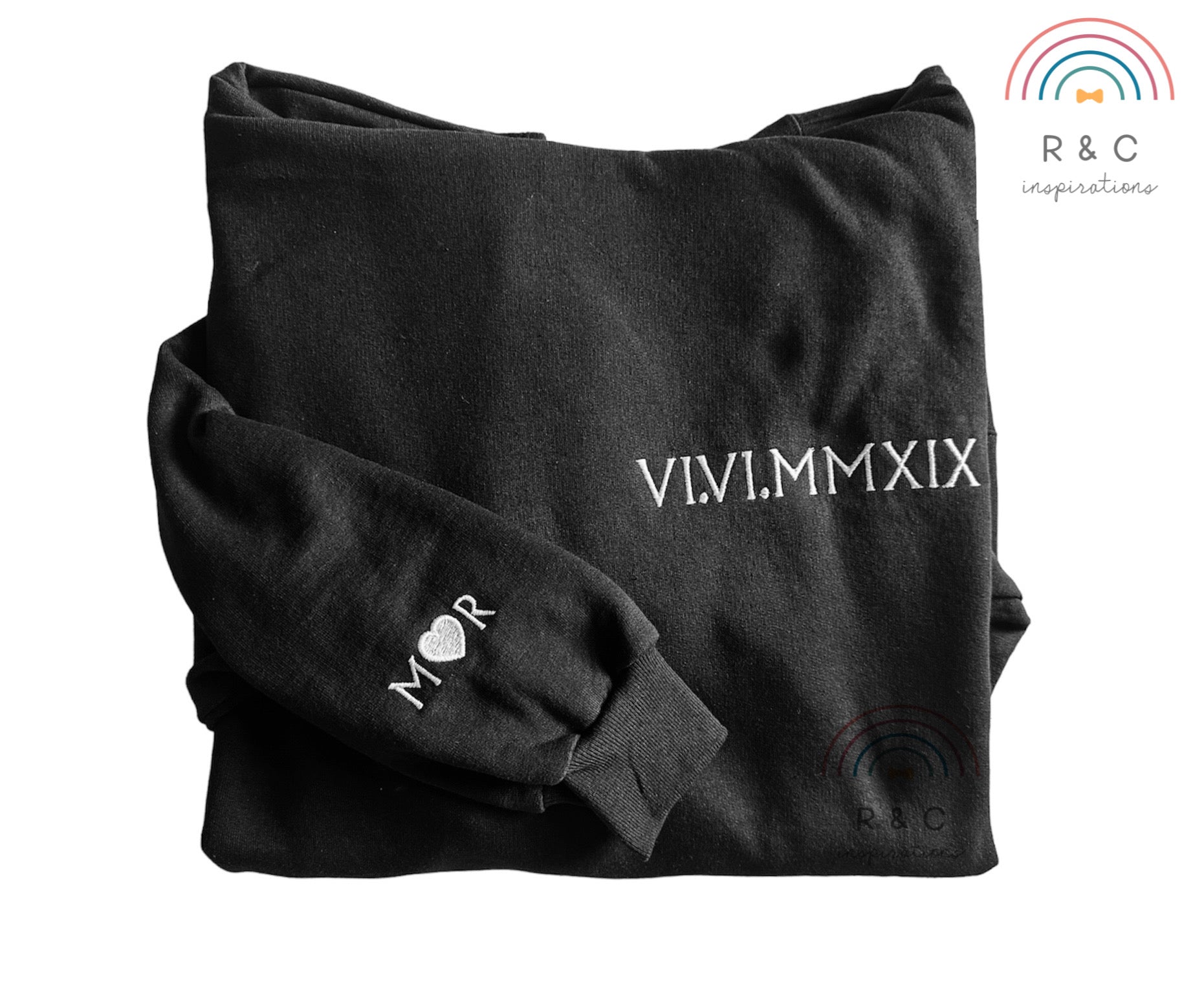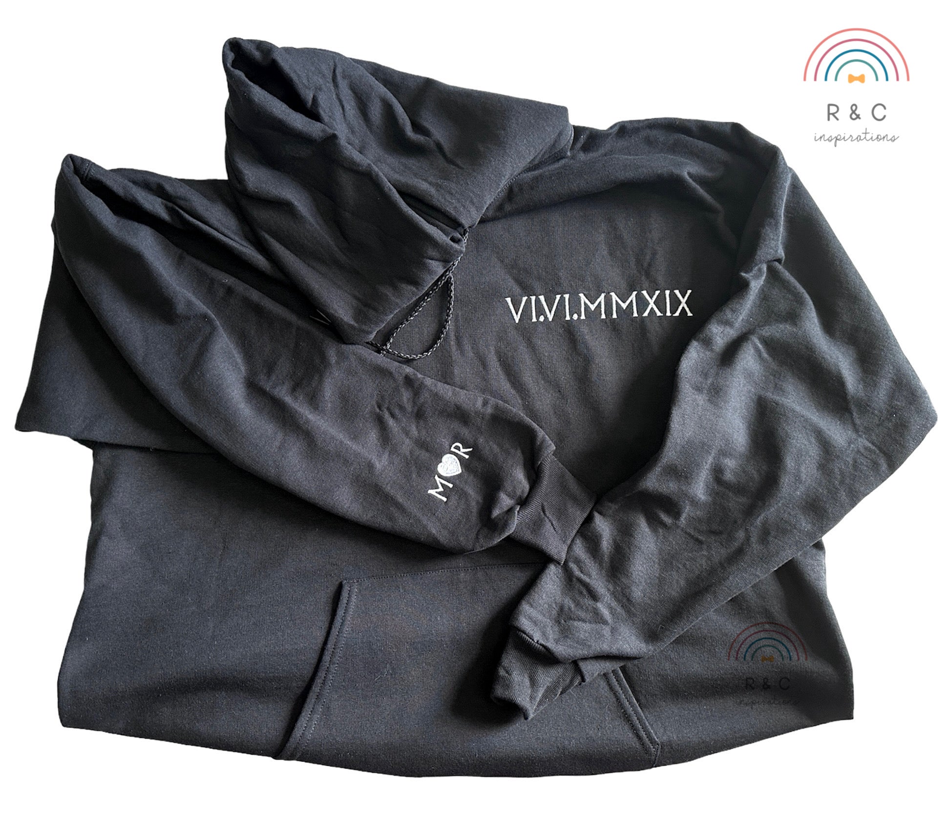 Roman Numeral Date Hoodie or Crewneck W/Sleeve Addition