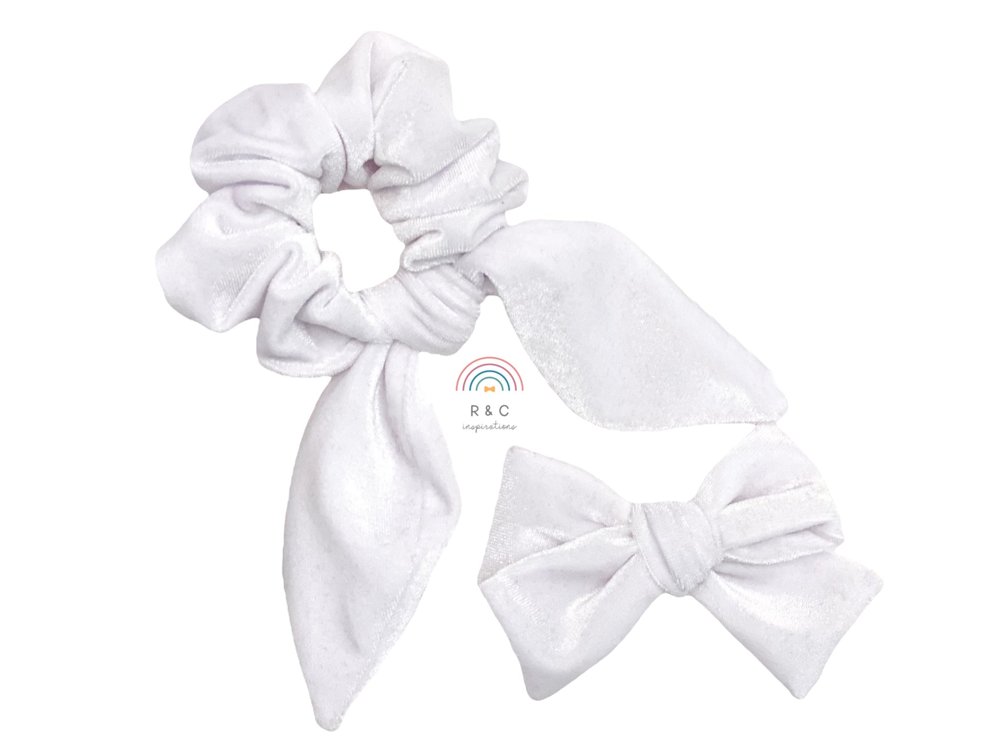 Our hand tied bows, detachable bow scrunchies and bow headbands have a practical design for frequent use with ease and grace. The tie feature on the hair bow allows for the clip to be switched to wear on the right or the left at anytime for versatility. The tie feature on the bow scrunchie and headband is detachable and allows for the bow to be tied onto another rubber band two get two uses out of one!